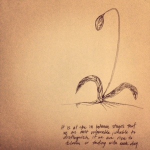 To fade or to bloom Posted on January 28, 2014 by Paige Stewart Leave a comment It is at the in between stages that we are most vulnerable. Unable to distinguish if we are ripe to bloom or fading with each day. Share this: Click to share on X (Opens in new window) X Click to share on Facebook (Opens in new window) Facebook Click to share on Pinterest (Opens in new window) Pinterest Click to email a link to a friend (Opens in new window) Email Like Loading... Related